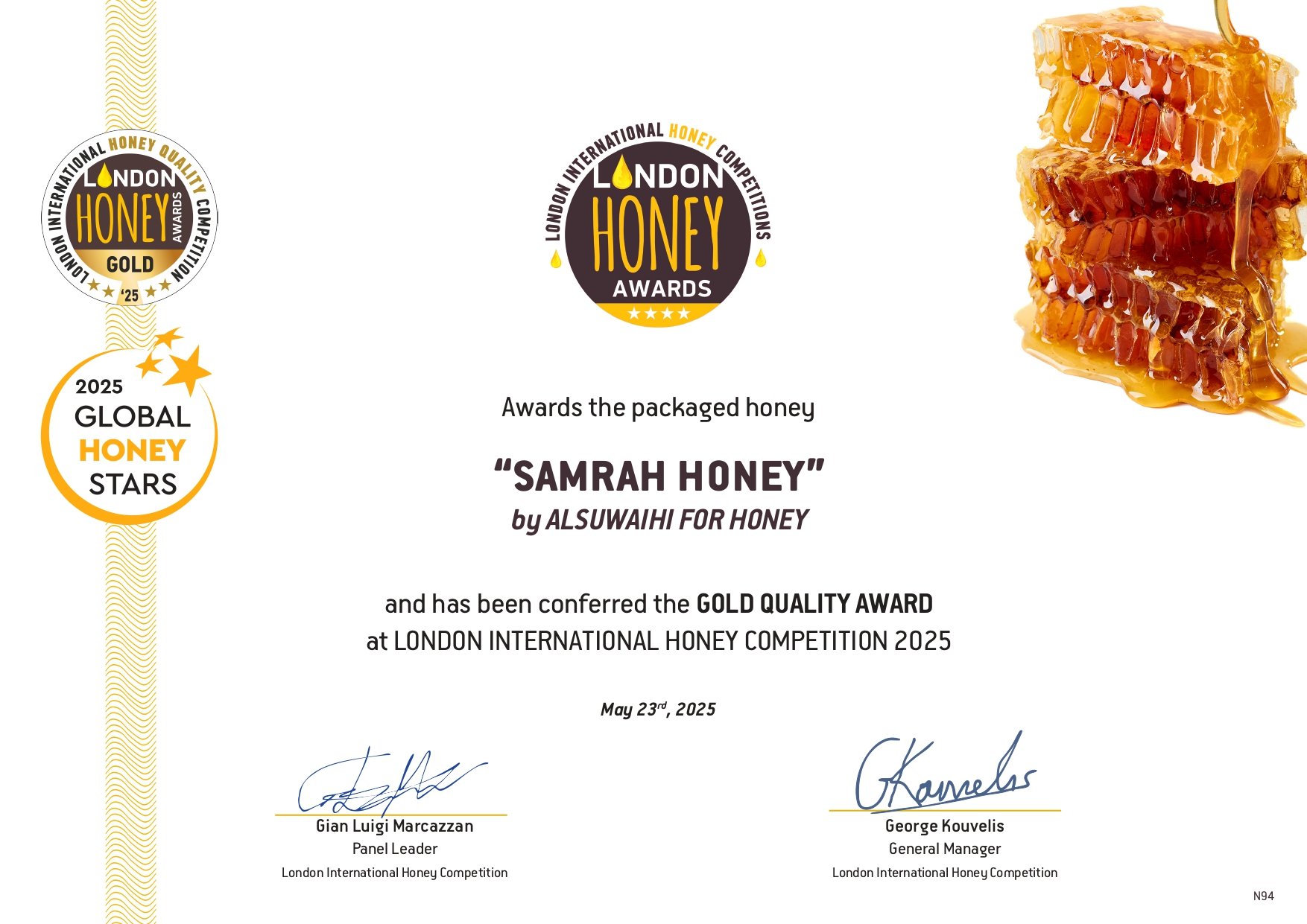 - عسل السمر : حصلنا على الجائزة الذهبية في مسابقة لندن لافصل انواع العسل لعام 2025 :