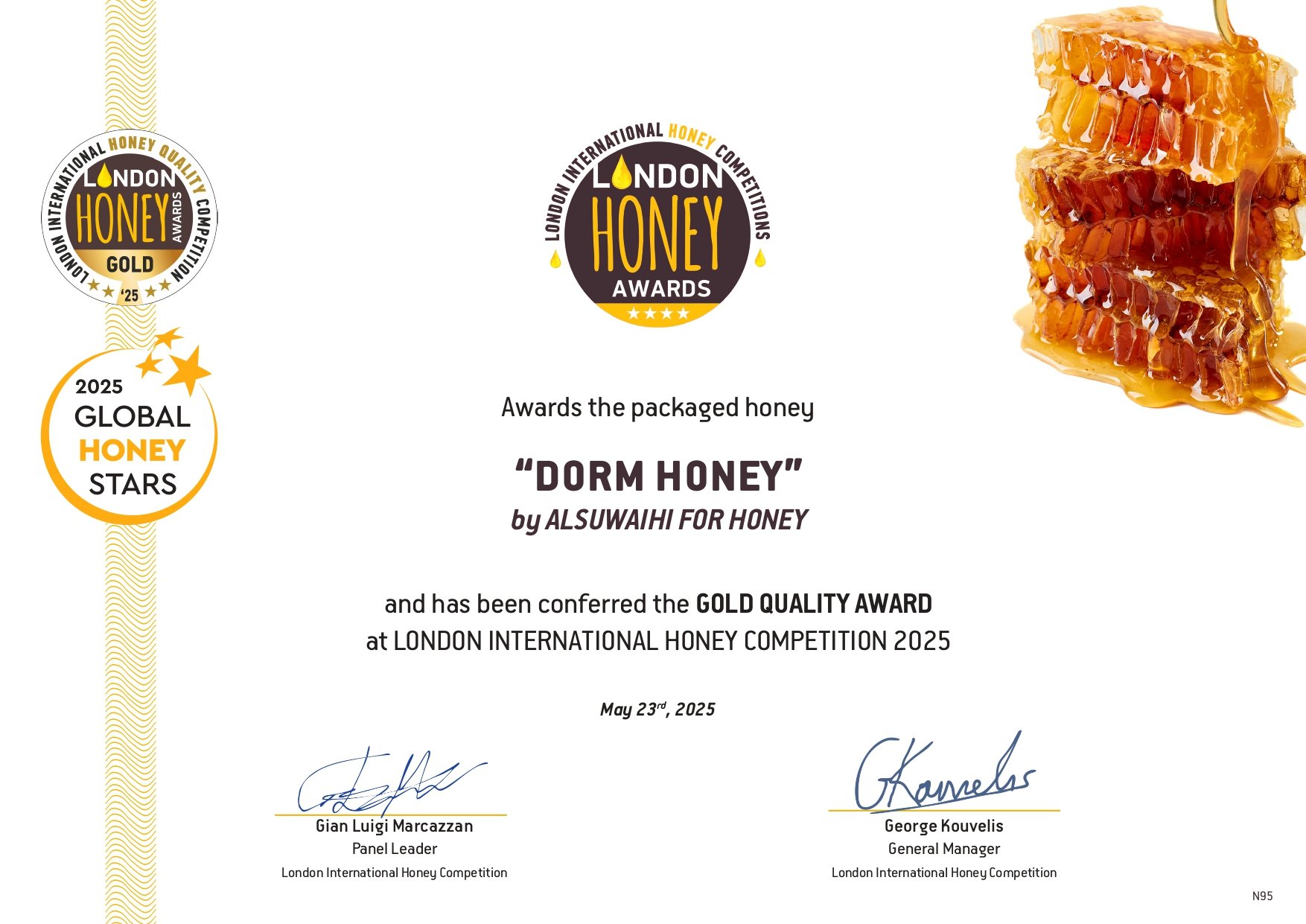 - عسل الضرم : حصلنا على الجائزة الذهبية في مسابقة لندن لافصل انواع العسل لعام 2025 :